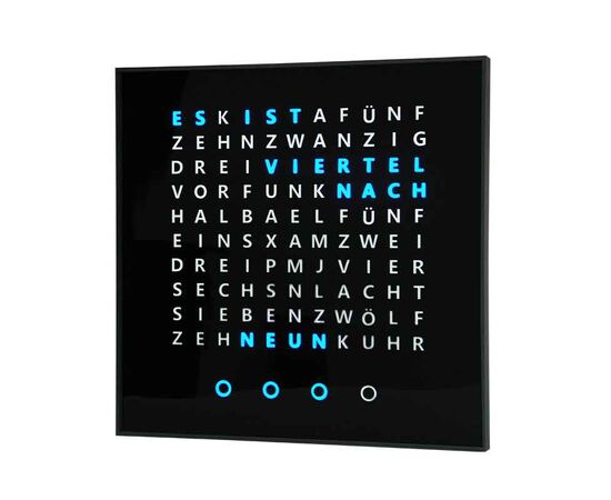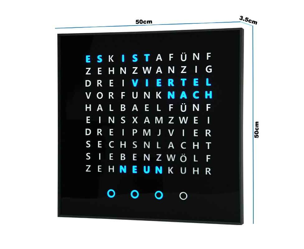 Die Verba Aurea Wortuhr ist eine moderne Design-Wanduhr von Verba Aurea im quadratischem Format (50 × 50 × 3,5 cm) und elegantem schwarzem Gehäuse sowie schwarzem Zifferblatt. Leuchtende LED-Worte zeigen die Zeit auf besondere Weise an – nicht in Zahlen, sondern in klar lesbaren Worten. Angetrieben wird die Uhr durch ein präzises Quarzwerk und betrieben über einen 220 V Adapter.